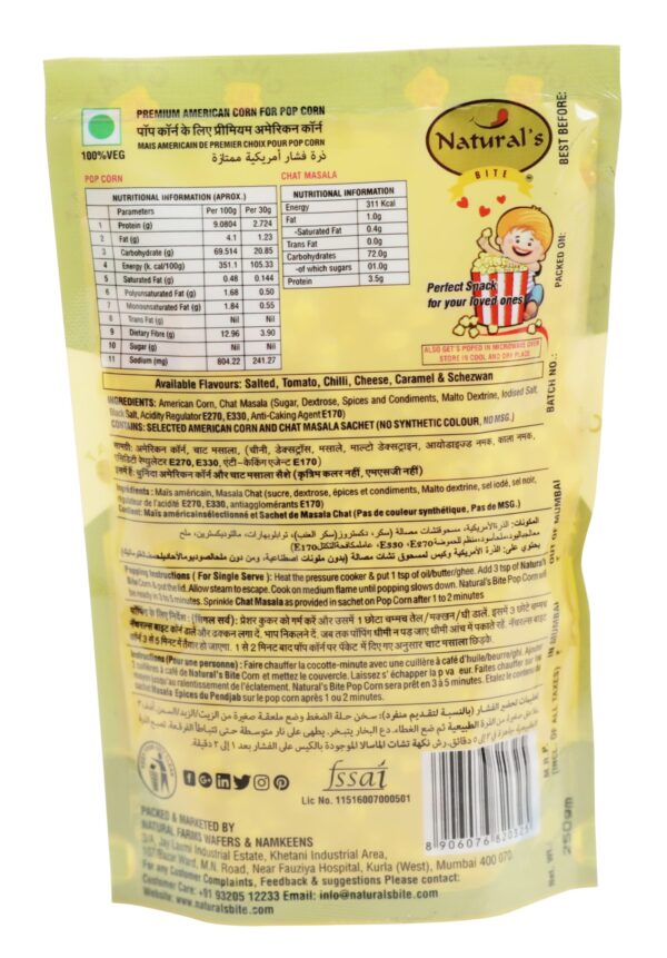 American Corn, Chat Masala (Sugar, Dextrose, Spices and Condiments, Malto Dextrine, Iodised Salt, Black Salt, Acidity Regulator E270, E 330, Anti-Caking Agent E170) CONTAINS: SELECTED AMERICAN CORN AND CHAT MASALA SACHET (NO SYNTHETIC COLOUR, NO MSG.)