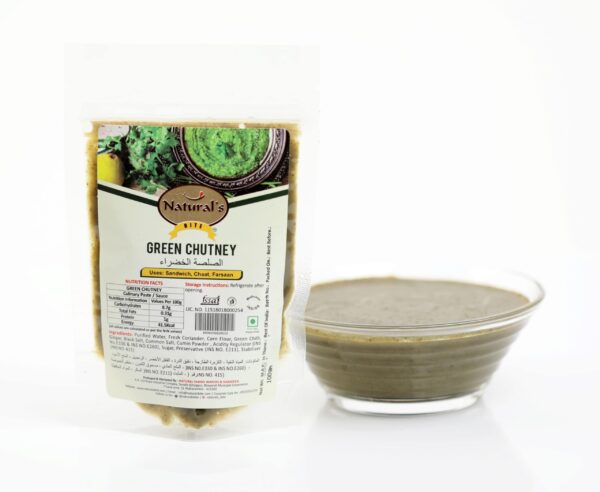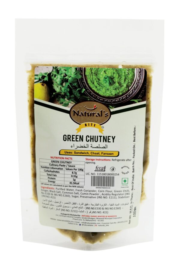 Purified water,fresh coriander, corn flour, green chilli, ginger, black salt, common salt,cumin powder, acidity regulator(ins no. e330 & ins no.e260), suger preservative (Ins no. E211),stabilizer (Ins no.415)